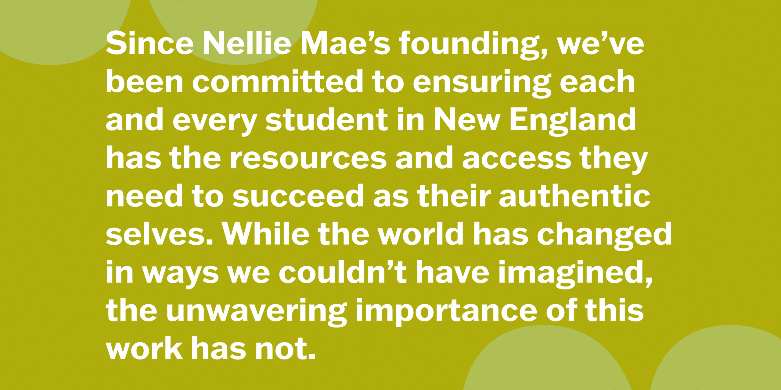 Since Nellie Mae’s founding, we’ve been committed to ensuring each and every student in New England has the resources and access they need to succeed as their authentic selves. While the world has changed in ways we couldn’t have imagined, the unwavering importance of this work has not.